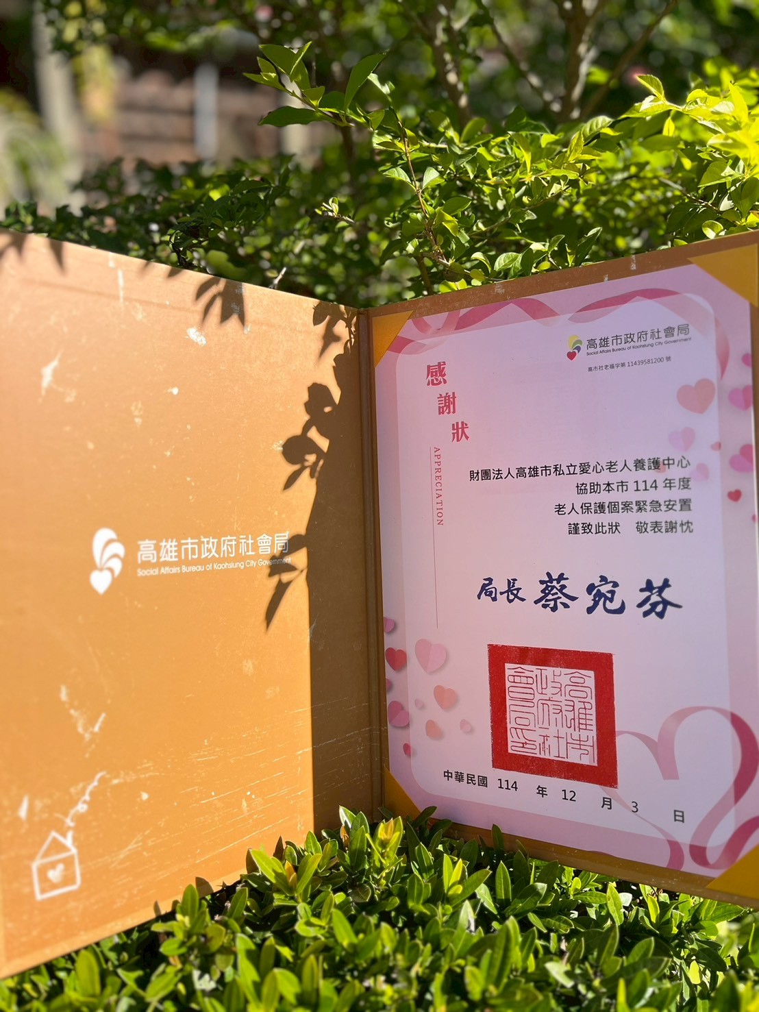 榮獲高雄市政府社會局頒發感謝狀